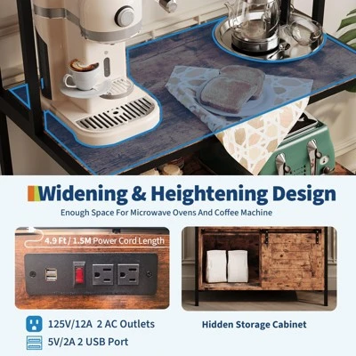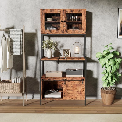 Add smart style and storage to your home with this 5-tier bakerās rack. Featuring open shelves and two cabinets, it offers generous space for kitchen gear, dĆ©cor, or pantry items. The built-in charging station with 2 AC outlets and 2 USB ports keeps your devices powered and cords organized. Crafted from durable engineered wood and a sturdy metal frame, it supports heavy appliances like microwaves or air fryers. The waterproof surface wipes clean easily, and setup is a breeze with clear instructions. Ideal for kitchens, dining rooms, or apartments seeking functional charm.
