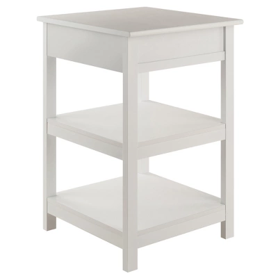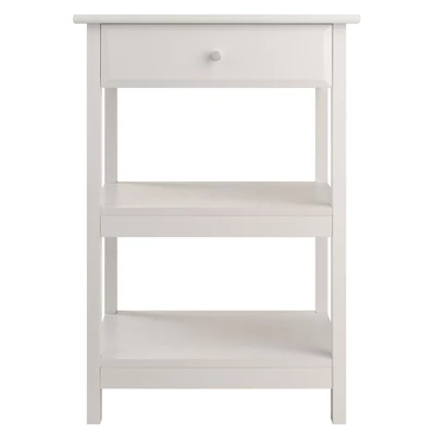 The table features a soft-close drawer with a silver accent pull and two open shelves that provide plenty of storage space. Made of composite wood in White finish. Assembly required.