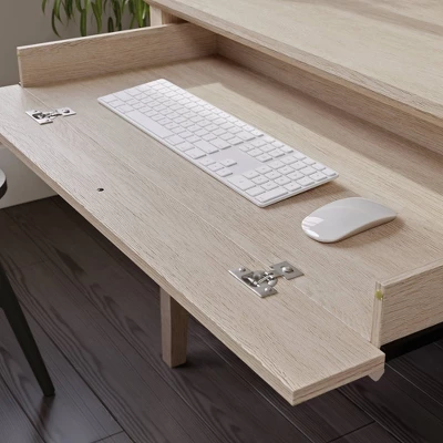 Give your home office or workspace a refined update with this single pedestal desk from the East Adara collection. The spacious top surface of this computer desk with drawers provides you with ample amount of room for all your must-have desk essentials like your laptop, folders and documents, a cup full of pens and of course, a place to set your coffee. This home office desk with storage features a large drawer/shelf that includes a flip-down panel for your keyboard/mouse, keeping the top surface clutter free. Two storage drawers that open and close on full extension slides are ideal for easy access of other miscellaneous office items. The lower drawer holds letter-size hanging files to help keep you and your most important files organized. Finished on all sides for versatile placement, the elegant design of this desk with keyboard tray will look polished from all angles. Finished in Cascade Oak, this computer desk with storage will have you feeling motivated and ready to get the job done.