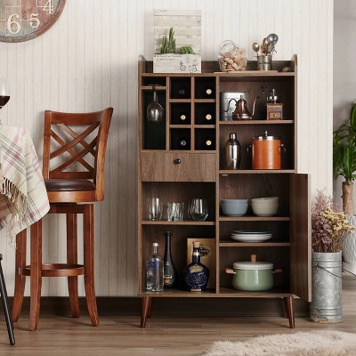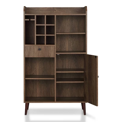 Easily organize your entire kitchen or bar with this Wine Rack. Multiple open shelves let you stylishly store and display dinnerware, glasses and spirits, while the single drawer and cabinet provide discreet storage for bar tools, pots, pans and more. Use the wine and stemware glass rack to effortlessly entertain and elevate your look with decor thanks to the variety of open shelves. Crafted of Wood and resting atop turned legs, the Elmora Wine Cabinet in distressed walnut updates your kitchen or bar to charming and timeless mid-century style.