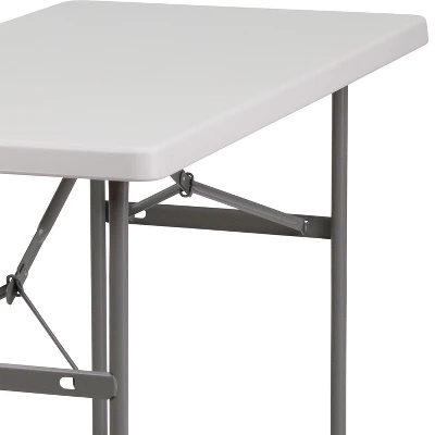 Having a plastic folding table on hand pays for itself in no time if you love hosting regular dinner and social activities at your home. The 24×48 plastic folding table is perfectly sized for game night with the family and can be stored away afterward. Setup permanently in your arts and crafts room to get back to your project at will without having to break down nightly. With an easy to clean granite white surface you can pick up spills and get back to the fun. When you’re ready to store the legs lock underneath the top for better portability and flat storage. As a traveling caterer having folding tables on hand to display your latest creations are a must. With a multitude of uses foldable tables are the most convenient choice for your home or business. Additional Features: Gray Powder Coated Locking Legs with protective floor caps