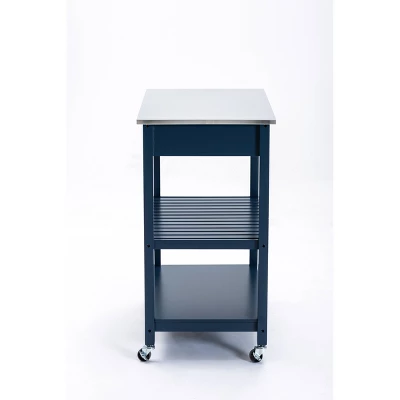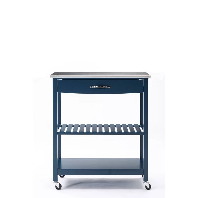 If you need a little extra storage and prep space for your kitchen, look no further than the Holland Kitchen Cart With Stainless Steel Top. This rolling kitchen cart also makes a great bar cart! Store dishes, glassware, cutlery, or your favorite spirits on the lower shelves. A slender drawer conveniently holds napkins, utensils, corkscrews, and other kitchen must-haves. Use the rolling caster wheels to roll this cart from the kitchen to the living room whenever guests are over, then wheel it back when it’s time to wash the dishes. It’s built from pine wood and medium density fiberboard with a stainless steel work surface. Ready for assembly upon delivery.