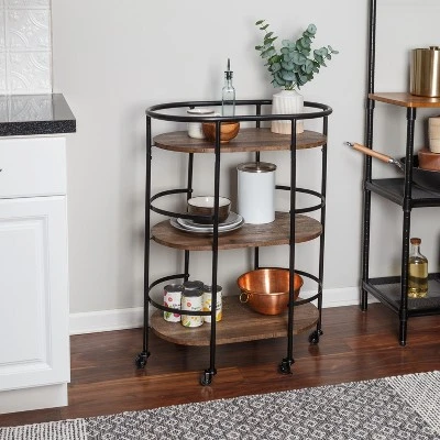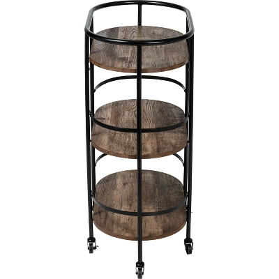 This 3-tier black and rustic brown bar cart is the life of any party as it stylishly makes its way from room to room, and when it gets there two of its rubber casters lock to hold it firmly in place. Three roomy shelves can handle anything from spirits and shakers to glasses and bottles, with the occasional snack thrown in for good measure. Its sturdy frame includes rails on all three shelves to keep everything securely in place. And as Saturday night blurs into Sunday morning, it doubles as a coffee cart or an everyday kitchen cart in the busiest room in your home.