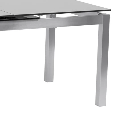 The Armen Living Ivan contemporary extendable dining table is a wonderful addition to the modern dining room. The gray tempered glass top is coupled with an elegant brushed stainless-steel base that gives the Ivan a unique and original flair. The table can be extended by simply pulling at one end, no additional storage necessary, the table extension is tucked under the tabletop. The versatility and style of this table make it a standout piece of furniture for your dining room space. Product Dimensions: 63-79″W x 35″D x 30″H