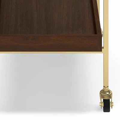 Bring elegant and simplistic style to your living, kitchen, and dining space with the Moyer Bar Cart, offering plenty of space with its three-tier storage. Featuring three shelves, two solid wood, one tempered glass and a durable metal frame in a gold finish. Equipped with sturdy casters for better mobility, this piece offers incredible versatile and can be used as a bar or tea cart for serving drinks, glassware, silverware, and condiments. This beautiful and well-crafted cart is perfect for your entertaining and storage needs.