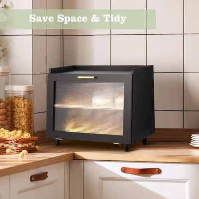 1️⃣ Spacious 2-Layer Storage• Holds multiple bread types (loaves/rolls/muffins) with room to prevent crushing• Ample 14.6″x9.4″ dimensions keep baked goods fresh and intact2️⃣ Smart Visibility Design•Clear acrylic door for at-a-glance content checks• Smooth magnetic closure + durable metal hinges• Secure yet easy access to content3️⃣ Premium Bamboo Construction• Waterproof bamboo surface resists moisture• Exceptionally sturdy for long-term use• Maintains ideal bread storage conditions4️⃣ Multi-Functional Organizer• Flat fenced top safely holds spices/fruits• Stores cutlery or kitchen essentials• Reduces counter clutter stylishly5️⃣ Modern Farmhouse Elegance• Sleek black finish with gold handle accent• Fluted door panel adds sophistication• Complements any kitchen decor style