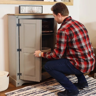 This sophisticated accent cupboard will add elegance and convenient storage to any room. Made of solid pine, the stylish storage cupboard features a two-tone color scheme with a pine cupboard top and a gray finish. The two doors feature beautifully molded details that will complement a variety of decor and furniture styles. Zinc alloy door pulls and hinges give the cabinet an antique appearance. This rustic sideboard cabinet has a sturdy construction and an overall weight capacity of 130 lbs. The accent cabinet has two interior shelves to keep your items neatly organized. Each shelf has a weight capacity of 40 lbs. This versatile cabinet is designed for indoor use and is a wonderful addition to the bedroom, living room, office, or sunroom. Use it to hide away unsightly clutter and store a variety of items, including books and media, pots and pans, cleaning supplies, and arts and crafts items.