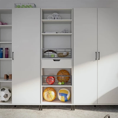 Revolutionizing the way we tackle our hobbies, or day-to-day life, demands Variotile solutions that streamline and save time. The Vario Collection from Room & Joy is that Variotile solution. Whether you’re crafting, woodworking, painting, or just keeping up with Honey-Do Lists, an organized garage or She Shed is the blueprint to a successful project. The Vario Open Cabinet with Drawer provides plenty of open storage with 5 spacious shelves, 3 of which are adjustable, and one convenient drawer for smaller items. The Open Cabinet is made from laminated engineered wood with powder-coated metal feet for a clean and classic look to match any décor. A wall anchor is included with this unit to prevent tipping injuries and maximize safety. Mix and match with other items from the Vario Collection for total organized living. (each sold separately) The Cabinet ships flat to your door and requires assembly upon opening. Two adults are recommended to assemble. Once assembled, the Cabinet measures to be 23.70“ W x 15.51“ D x 75.20“ H.